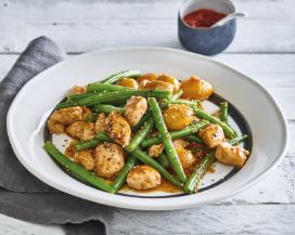 Maak de sperziebonen schoon en kook ze drie minuten. Spoel ze direct daarna goed koud en laat ze uitlekken.Schil de gember en hak het fijn. Hak ook de knoflook fijn. Verhit een scheutje olie in een wok en fruit de knoflook en gember even aan. Voeg vervolgens de kip toe en bak deze een paar minuten mee. Doe de kip, knoflook en gember op een bord en dek af met aluminiumfolie. Verhit opnieuw een scheutje olie in de wok en bak de krieltjes een paar minuten op hoog vuur aan. Zet het vuur lager en laat de krieltjes nog even verder garen. Zodra de krieltjes (bijna) naar wens zijn voeg je de sperziebonen en het sesamzaad toe en wok je deze even mee. Voeg tot slot de kipfilet weer toe en ook de ketjap, sambal en een klein scheutje water. Laat alles nog even pruttelen.
