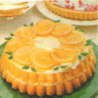 Snijd de cake (horizontaal) doormidden en breng als vulling een gedeelte van de citroen boter creme aan. Deze wordt gemaakt door de boter met de poedersuiker, de citroenschil en het citroensap tot een zachte créme (beurre) te roeren. Spreid de rest van de créme over de bovenste kant van de cake. Leg de citroen schijfjes erop, zoals in de afbeelding en bestrijk deze met glazuur. Garneer de taart met Angelique (suiker blaadjes)
