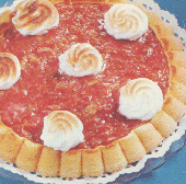 Roer de boter en de suiker tot een romige massa. Werk het meel, de eierdooier en zoveel water erdoor, dat goed kan worden gerold. Kneed het deeg luchtig, rol het uit en bekleed er een vlaai vorm van 20 cm doorsnee mee, die op een omgekeerde bakplaat of koekvorm wordt gezet. Bak het korstdeeg 'blind' (ongevuld) 20 a 25 minuten in een warme oven van 200 graden, tot het baksel goudbruin is. Kook intussen de gesneden rabarber met de suiker en zonder water gaar en klop ze tot moes. Roer de maizena glad met water en voeg dit toe en kook het moes totdat het dik is. Klop de eierdooiers erdoor en giet het mengsel in de deeg vorm. Sla de eiwitten stijf, klop er geleidelijk de helft van de poedersuiker door en spatel de rest van de suiker erdoor. Spuit of schep het schuim op het rabarbermoes en zet de taart nog 20 minuten in een matige oven. (100 - 150 graden)