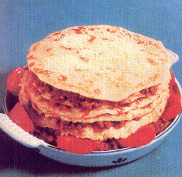 Besmeer de onderste pannenkoek met wat boter, doe hierop wat vlees mengsel en herhaal dit tot de laatste pannenkoek. Garneer deze met de geraspte kaas, leg stukjes tomaat rondom de stapel pannenkoeken.