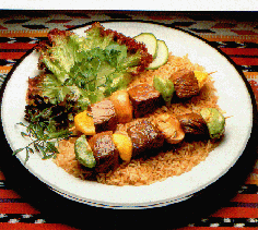 Verwijder overtollig vet. Snijd de biefstuk in blokjes van 3 cm. Deze 10 minuten marineren in