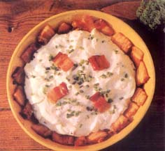 Serveer de dip in een schaal en leg het koude spek en de fijngehakte bieslook erop.
