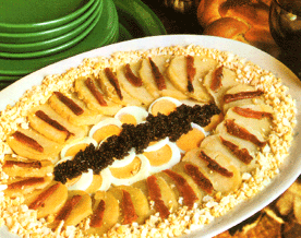Leg dan de aardappelschijven dakpansgewijs midden op een schotel. Laat de ansjovis filets uitlekken. Snijd of knip de filets overdwars door en leg de stukjes op de aardappelen. Schep het fijngemaakte eimengsel rondom de aardappelen en garneer de schotel met de plakjes ei en kaviaar.