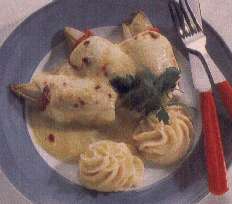 De bittere punt uit de witlof snijden. Witlof wassen en ca 18 minuten in water met zout koken. De struikjes goed laten uitlekken. Intussen de grill of de oven voorverwarmen. Kaassaus maken volgens de bereidingswijze op de verpakking. Wat nootmuskaat erdoor roeren. Ieder struikje witlof in een plakje tong rollen en naast elkaar in een ovenschaal leggen. De saus erover schenken en bestrooien met geraspte kaas. De kaas onder de grill of in de oven lichtbruin laten kleuren. Serveren met aardappelpuree, gemengd met tuinkruiden.