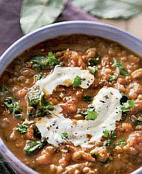 Verhit de olijfolie in een soeppan en bak de spekblokjes knapperig. Voeg de ui, laurier, tijd, tomaten, linzen en bouillon toe en laat ca. 5 minuten pruttelen. Breng op smaak met zout en peper. Laat de spinazie slinken in de hete soep. Serveer de soep met een flinke schep Griekse yoghurt erin en bestrooi met de peterselie.