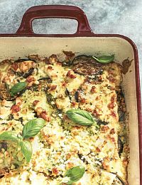 Snijd de aubergines in plakken van 1/2 cm dik en bestrooi met zout. Leg ze tussen keukenpapier op een bord. Stapel het volgende bord er bovenop en verzwaar met een pan met water. Laat dit zo ongeveer 20-30 minuten rusten. Kook de aardappels met de schil in ongeveer 10 minuten. Verhit boter in een steel pan, roer de bloem erdoor en laat al roerende een halve minuut garen op laag vuur. Giet er dan de melk bij en klop met een garde tot een mooie bechamelsaus. (Hij gaat een beetje binden) Breng dan op smaak met peper en zout en een snufje nootmuskaat. Pel daarna de aardappels en snijd ze in plakjes. Dep of veeg de aubergine droog en verhit de eetlepels olie in een koekenpan en bak hierin de aubergine plakje om en om tot ze mooi bruin kleuren. Laat uitlekken weer op een bord met keukenpapier en bestrooi ze met wat zout, peper en iets kaneel. Verwarm de oven voor op 200 graden. Vet een ovenschaal in en verdeel daarna een lepel bechamelsaus over de bodem van de ovenschaal en vervolg met een laagje aardappel, dan weer iets bechamelsaus, een laagje feta met de aubergine en een beetje pistou. Eindig met een laagje bechamelsaus en wat feta. Bak vervolgens in het midden van de oven goudbruin en garneer met basilicum.