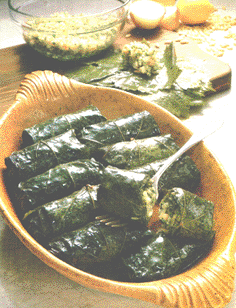 Uitgelekte druivenbladeren, met de glanzende kant naar onderen, op een werkvlak uitspreiden. Op ieder druivenblad 1 theelepel vulling leggen. Zijkanten van de bladeren over de vulling naar binnen vouwen en ieder blad in de richting van de punt oprollen. Niet te strak oprollen, want de rijst zet bij het koken nog een beetje uit. Een grote pan met druivenbladeren bekleden en hierop de rolletjes leggen. Over iedere laag een beetje peper en zout strooien. Rest van de olie toevoegen. Citroensap erbij gieten en met heet water aanvullen tot de druivenbladeren onder staan. Op de bladeren een omgekeerd deksel leggen zodat de rolletjes niet open kunnen gaan bij het koken. Zelf leg ik altijd een klein (zwaar) bord in de pan. Aan de kook brengen en 1 uur met deksel op de pan op matig vuur zachtjes laten koken. Gevulde druivenbladeren laten afkoelen en koud als voorgerecht, met partjes citroen en yoghurt serveren.