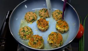 Vorm dan het tonijnmengsel kleine hamburgertjes en bak deze even heet in een pan met olijfolie.