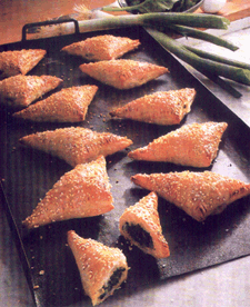 Feta kaas zo nodig in het water leggen om de mildere smaak te krijgen. Bladerdeeg ontdooien. Spinazie ontdooien en koud laten worden voordat u hiermee kunt gaan mengen..... Zelf kook ik de spinazie (verse) altijd een uurtje van tevoren. Voorjaarsuien pellen en raspen of zeer fijn snijden. Fetakaas laten uitlekken en droog deppen. Spinazie met de voorjaarsui, kaas, ei (dooiers bewaren) zout en peper en oregano vermengen. Intussen het ontdooide bladerdeeg op een met bloem bestoven werkblad leggen en hiervan 4 plakken ter grootte van 10x20 cm en 2 mm dik rollen. Afwisselend in de breedte en in de lengte afrollen. 6 vierkantje van 10x10 uitsnijden. (Ik gebruik kant en klaar deeg) Oven op 190 - 220 graden voorverwarmen. In het midden van de vierkantjes een hoopje vulling leggen. Deegrand met water bestrijken, dichtklappen en de randen met een vork aandrukken. Tot slot met losgeklopte eierdooier bestrijken. Flappen met Sesamzaad bestrooien water erover sprenkelen en op een bakblik in het midden van de oven in 15 - 20 minuten op 190 graden goudgeel bakken.