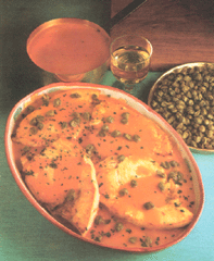 saus is ontstaan. Warm daarin de vis nog even op, zodat ie goed gaar wordt. Schenk een deel van de saus in een voorverwarmde sauskom en voeg naar smaak zout en peper toe. Proef de saus waarin de vis is opgewarmd en voeg daaraan tijm en de kappertjes toe met naar smaak ook zout en peper en wat sojasaus. Serveer de vis zo warm mogelijk.