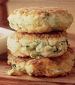 Schil de aardappels en kook ze gaar in water met war zout. Stoom de kool en de bosui in 4 min. gaar, maar wel nog knapperig. Giet de aardappels af. Voeg melk en boter toe en maak met behulp van een stamper of knijper puree. Breng op smaak met flink peper en zout en schep de groenten erdoor. Vorm met de hand vier platte koeken van de puree. Bestrijk beide zijden dun met ei en bestuif de koeken met bloem. Bak de aardappel-groentekoeken in 5 min. aan beide kanten goudbruin in een anti-aanbakpan, in weinig hete boter of olie. Lekker met zelfgemaakte appelmoes.