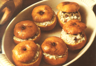 Was de appels en droog ze daarna af. Was de rozijnen in een zeef, verwijder de steeltjes en droog ze op keukenpapier. Roer dan 3 eetlepels citroensap met wat kaneel door de rozijnen. Bestrijk een ovenschotel met boter. Schep de rest van de boter met de room door de rijst. Snijd aan de bovenzijde van de appels een flinke kap af, neem met een lepeltje het klokhuis uit de appel en hol ze verder uit, maar beschadig de schil niet. Schep de rozijnen met suiker naar smaak door de rijst en verdeel die over de uitgeholde appels. Zet de appels in de ovenschaal in de oven en zet de kap weer op de appel. Schuif het rooster in het midden van de oven en verwarm deze voor. Los 2 tot 3 eetlepel suiker op in 2 dl. water, voeg daar de rest van het citroensap aan toe en schenk de vloeistof over de appels in de ovenschaal. Zet deze in de oven tot het dessert door en door warm is en de appels zacht zijn geworden.