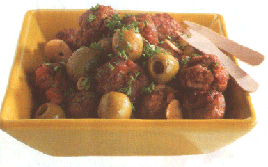 Meng 250 gram gehakt met 4 eetlepels los geklopt ei, 2 eetlepels gehakt kruiden eetlepel paprikapoeder, de Chorizo worst en 2 eetlepels tomatenketchup. Maak er vervolgens kleine balletjes van. Bak deze even in de olijfolie op een matig hoog vuur voorzichtig lekker bruin. Voeg de knoflook olijven toe en een scheut sherry en laat alles nog 3 minuten zachtjes pruttelen. Bestrooi met de peterselie. Warm of koud serveren.