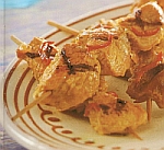 Snijd het vlees in blokjes van 2-3 cm. Schil de gemberwortel en rasp hem fijn. Pel en snipper het sjalotje. Snijd de Spaanse pepers overlangs doormidden, verwijder de zaadjes en snijd het vruchtvlees in ragfijne reepjes. Meng in een grote kom de gember, de sjalot, de Spaanse peper, olijfolie, komijn en saffraan, kaneel en schep de vleesblokjes erdoor. Dek de kom af met plastic folie. Laat het vlees minimaal 3 uur (liefst 1 nacht) marineren in de koelkast. Schep het vlees wel regelmatig om. Rijg het vlees aan kleine spiesjes en grill ze ca. 7 minuten in een grillpan of op de barbecue of onder de grill in de oven, tot het vlees bruin en net gaar is. Keer ze af en toe om. Serveer de spiesjes met rode pepersaus.