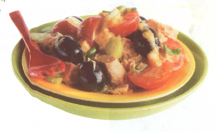 Meng het sap en de geraspte schil van de sinaasappel, 1 teentjes knoflook (fijngehakt) 2 theelepel mosterd, wat cayennepeper, wat zout, 2 eetlepels mayonaise en 4 eetlepels olijfolie. Voeg het blikje (uitgelekte) tonijn toe. Snijd de lente uitjes in ringetjes. Doe de kersentomaatjes en de olijven vervolgens in het mengsel. Grote kersentomaten in vieren snijden. Lekker met stokbrood of Chiabatta