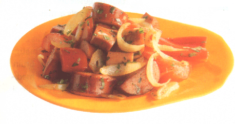 Verhit een scheut olijfolie in een ruime koekenpan. Bak hierin de ui gehalveerd en in smalle reepjes gesneden, 1 rode paprika in grove stukken gesneden, 1 rookworst in dikke doormidden gesneden plakjes, 1/2 theelepel cayennepeper, 1/2 theelepel gemalen komijn, 4 minuten op matig hoog vuur. Zet het vuur hoog en bak 4 tenen knoflook mee, gesneden in zeer dunne plakken, snel bruin. Schenk er een scheutje medium sherry bij en laat het even bruisen. Schep er vervolgens wat peper en 3 eetlepels fijngehakte koriander door. Warm of koud serveren.