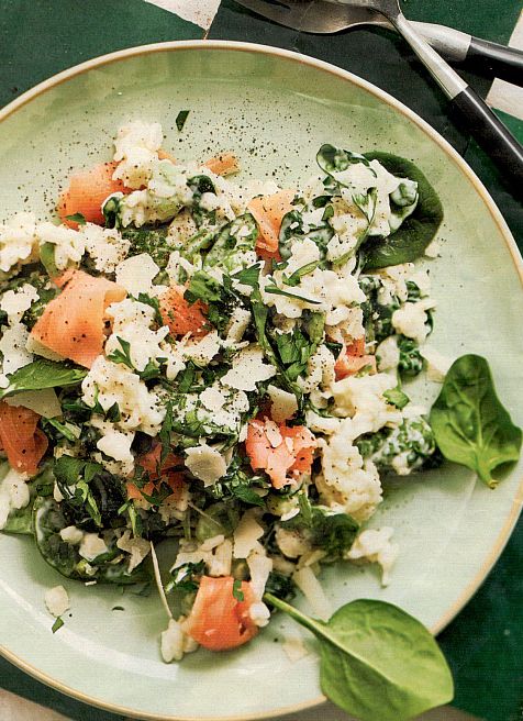 Verhit de olijfolie in een pan met dikke bodem en fruit hierin de sjalotten en de knoflook ca. 3 minuten. Schep de risotto rijst erbij en roer tot de korrels glazig zijn. Giet de wijn bij de rijst en roer tot al het vocht is opgenomen. Schep hierna steeds een soeplepel kippenbouillon in de pan en blijf roeren. Voeg een nieuwe schep bouillon toe wanneer het vocht bijna is ingekookt. Roer, als de rijst nog net niet beetgaar is, de citroenrasp, citroensap en mascarpone door de risotto. Voeg de tuinbonen en de spinazie toe en kook ca. 5 minuten mee. Roer de zalm erdoor en breng op smaak met peper en zout. Bestrooi de risotto met de peterselie en Parmezaanse kaas.