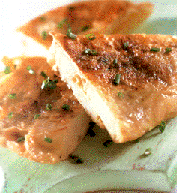 Bak de omelet 2 minuten en keer hem om. Bak daarna de andere kant 1 minuut. Laat de omelet afkoelen, bestrooi hem met gesnipperde bieslook en snijd hem in punten. Een Spaanse omelet lijkt op een beetje op een platte koek.