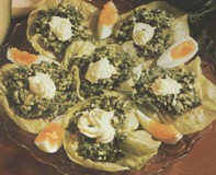 Was de spinazie zeer goed en kook haar in 5 minuten net gaar. Laat de spinazie uitlekken in een zeef. Verwarm de boter, fruit daarin het uitje glazig. Snijd de spinazie fijn met een mes of met een huishoud machine. Roer hier vervolgens de ui snippers door. Snijd de avocado's overdwars tot op de pit, schep het vruchtvlees in kleine stukjes door de spinazie. Maak 1 ei met de vork niet al te fijn, schep door de spinazie en voeg er vervolgens wat worcestersaus bij. Breng het e.e.a. lekker op smaak. Leg op een platte schaal vier mooie stevige bladen sla, besprenkel deze met wat citroensap. Verdeel het spinazie mengsel over de bladen sla. Snijd het andere ei overlangs of overdwars enkele keren door en garneer de salade met ei en mayonaise. Serveer het gerecht meteen of bewaar hooguit 2 uur in de koelkast.