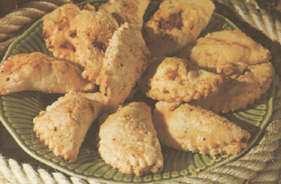 van de losgeklopte eieren en de tomatenpuree toe. Snipper de olijven zo fijn mogelijk en roer de snippers met de peterselie, het paprikapoeder en de olie door het garnalen mengsel Verwarm het frituurvet voor. Verdeel het garnalen mengsel over de lapjes deeg. Bestrijk de halve deeg rand met een beetje overgebleven ei en vouw ze dicht. Druk de randjes met een vork goed aan en bak ze vervolgens kort in het frituurvet door en door warm en mooi van kleur. Laat overtollig vet weg druppen en serveer zo warm mogelijk.