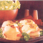 Let het grootste deel van de champignons op de toast, leg hierop de plakken Ham. vervolgens de goed uitgelekte eieren en giet het kaas mengsel er overheen. Garneer met de rest van de champignons en de peterselie.