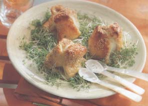 Kook de eieren hard in ca 7 minuten. Spoel ze daarna af onder de kraan en pel ze. Verwarm de oven voor op 200 graden. Verdeel het deeg in 6 driehoekjes. Zet in het midden een ei met de dikke kant beneden. Snijd er een klein plakje af zodat het ei beter blijft staan op het deeg. Vouw de punten van het deeg over het ei heen en pak het ei goed in. Zet de broodjes op een ingevetten ovenplaat en bestrijk het met het los geklopte ei en bestrooi met sesamzaad. Bak de broodjes in ca 15 minuten gaar in het midden van de oven.