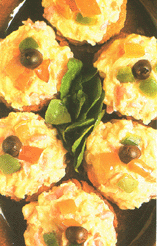 Smelt de helft van de boter in een diepe koekenpan. Snijd 6 rondjes, 8 cm middellijn uit 6 van de 8 sneetjes witbrood en snijd de andere twee sneetjes in reepjes van 1 cm breed. Week deze brood rondjes en reepjes in de gesmolten boter, leg ze op een bakblik en bak ze daarna 20 minuten in de oven op 200 graden, tot ze goudbruin en knapperig worden. Neem ze uit de oven en houd ze warm. Verwijder ondertussen alle zaadjes en zaadlijsten van de paprika en snijd hem in grove stukjes. Smelt 30 gram boter in een pan en fruit de paprika stukjes ongeveer 15 minuten. Laat ze op keukenpapier uitlekken en houd ook deze warm. Klop de eieren los met slagroom en doe er peper, zout en zalmsnippers bij. Smelt op een laag pitje de rest van de boter in een grote pan met een zware bodem en giet er het eimengsel in. Laat dit zachtjes, steeds roerend koken tot het mengsel begint te stollen. Neem dan de pan van het vuur en verdeel de massa onmiddellijk over de gebakken brood rondjes.