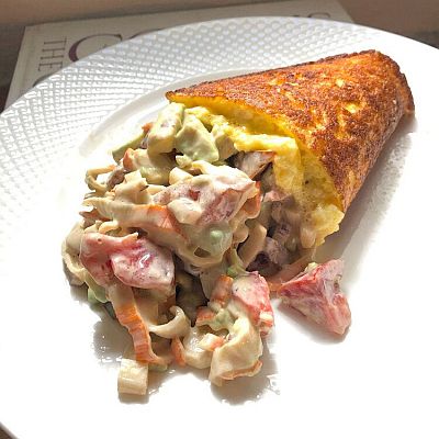 Smelt de boter in de pan en laat smelten op een gematigd vuur. Laat de boter niet bruin worden. Doe het opgeklopte eiermengsel in de pan en laat het een minuut of drie voorzichtig garen. De bodem van het ei moet goudbruin en stevig zijn en de bovenkant smeuïg. Ondertussen kun je de ingrediënten van de vulling mengen met de dressing.