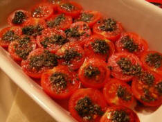 Snijd de tomaten door midden en doe ze in een schaaltje wat in de oven kan. Maak van de rest van de ingrediënten een sausje en besprenkel dit over de tomaatjes. Zet het schaaltje 10 minuten in de oven en geniet van de heerlijk zuidelijk smaak.