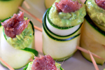 Maak het bord op met salade naar keuze, snijd de opgestijfde courgette rolletjes in plakken,