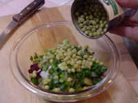 Kook de doperwten 3-5 minuten in ruim komend water met zout. Laat ze daarna uitlekken. Verhit de boter en bak daarin de ham ongeveer 3 minuten. Voeg de doperwtjes toe en warm ze even door. Roer dan de sla erdoorheen. Blijf roeren tot de sla warm is. Deze sla moet wel krokant blijven. Breng het gerecht op smaak met zout en peper en strooi er voor het serveren nog even munt en citroenschil overheen.
