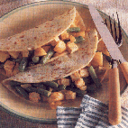 Pel en snipper de ui en de knoflookteentjes. Verhit opnieuw 2 eetlepels olie in wok of hapjespan en fruit de ui en de knoflook snippers ca 5 minuten. Voeg de kerriepoeder, de aardappelen en groente toe en roerbak het geheel nog ca 4 minuten. Schep op het laatst de tahoe door de curry en laat die snel door en door warm worden. Breng op smaak met peper en zout en wat sambal. Verhit wat olie in een koekenpan met anti- aanbak laag en bak de tortilla's of pannenkoeken stuk voor stuk, kort aan beide kanten. Schep de curry op de tortilla's of pannenkoeken en vouw die over de curry.