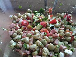 Goed uitgelekte en afgespoelde tuinbonen, tomaaat, ui, hamblokjes en Zeeuws spek en komkommmerin een saladekom mengen. Knoflook, peterselie, citroensap en olijfolie er doorheen scheppen. Op smaak brengen met komijn, zout en peper. De salade kan koud of op kamertemperatuur geserveerd worden.