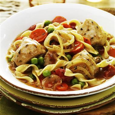 Verhit 2 eetlepels van de olie en fruit hierin de ui glazig.Voeg de kip toe en bak de plakjes 2 minuten. Voeg de champignons toe. Bak alles nog 2 minuten tot de kip gaar is. Strooi er de bloem over en schep alles goed door elkaar. Voeg voortdurend roerend met scheutjes tegelijk de wijn en de bouillon toe tot een gebonden geheel ontstaat. Temper de hittebron en laat het mengsel 2 minuten zachtjes koken. Snijd de kaas in kleine stukjes er roer ze door de ragout tot alles gesmolten is. Roer er de peterselie en wat zout en peper door. Optie: Kook de pasta in ruim water met zout en de rest van de olie beetgaar (al dente) (Olie voorkomt aan elkaar kleven van de pasta)