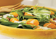 Rooster de pijnboompitten in een droge koekenpan goudbruin. Laat ze op een bordje afkoelen. Snijd de schil en het witte vel van de sinaasappels. Snijd de partjes boven een grote kom tussen de vliesjes uit en vang het sap op. Voeg 1/3 van de gorgonzola en alle olijfolie toe aan het sinaasappelsap en klop alles met een garde tot een romige dressing. Breng op smaak met zout en versgemalen peper. Snijd de ui in dunne plakjes. Schep de spinazie, de ui en de helft van de partjes sinaasappel door de dressing. Verdeel de spinazie salade over vier borden en strooi de pijnboompitten erover. Leg de rest van de sinaasappel partjes en de stukjes gorgonzola erop en serveer direct.