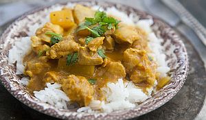 Uien en knoflook pellen en snipperen. Spaanse peper wassen, pitjes verwijderen en in dunne reepjes snijden. Mango schillen. Vruchtvlees in korte reepjes snijden. Kipfilet in reepjes snijden. Olie verhitten. Kip hierin lichtbruin bakken. Ui, Spaanse peper en knoflook toevoegen en even meebakken. Bestrooien met kerriepoeder en even meebakken. Slagroom, mango-chutney en bouillon toevoegen. Goed door elkaar roeren en aan de kook brengen. 5 minuten zachtjes koken. Mango toevoegen en 2 minuten meekoken. Op smaak maken met cayennepeper, zout en citroensap. Garneren met wat fijngehakte bieslook.