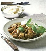 Breng een pan water aan de kook. Verhit een koekenpan met 2 eetlepels arachide olie. Bak de aubergine in 10-15 minuten zacht en zet apart. Verhit een koekenpan met 2 eetlepels arachide olie en bak de kip in 8 minuten bruin. Voeg 2 eetlepels curry pasta toe en bak even mee, voeg de kokosmelk toe en vermeng het goed met elkaar. Voeg de aubergine en citroengras toe en sluit af met een deksel. Laat dit 5 minuten zacht stoven. Kook ondertussen de rijst. Breng de curry en kip verder op smaak met zout en peper en roer als laatste de basilicum erdoor.