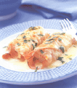 Roer de slagroom en de eierdooier door de saus maar laat het niet meer koken. Schenk daarna de saus over de rolletjes en strooi er de kaas over. Gratineer ze in het midden van de oven. Ongeveer 15 minuten. Bestrooi voor het serveren met de peterselie.