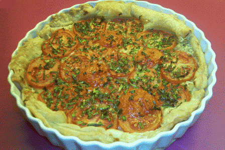 Je verwarmt de oven voor op 220 C. Je legt bakpapier in een ronde ovenschaal. Daarin gaan de plakjes bodem of bladerdeeg. Deze laat je eventjes opkomen in de oven (ze mogen niet bruin worden). Daarop smeer je de mosterd, een laagje kaas en plakjes tomaat. Dit geheel oversprenkel je met olijfolie en bieslook. Laat het ongeveer 25 minuten in de oven opwarmen en klaar is kees