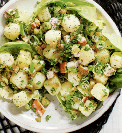 Kook de krieltjes circa 4 minuten in water met zout. Giet ze daarna af en laat ze afkoelen tot ze lauwwarm zijn. Schep de krieltjes in een grote kom. Doe hierin de bosuitjes, peterselie, augurken en de kip en schep goed door elkaar. Verdeel de IJsbergsla over de 4 borden en schep de krieltjessalade er bovenop en bestrooi met verse peper.