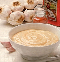 Alle inqredienten op kamertemperatuur laten komen. Korn omspoelen met warm water. Knoflookteentjes pellen en boven kom uitpersen. Ei splitsen en dooier in kom laten glijden (eiwit voor iets anders gebruiken). Toevoegen: zout en paprikapoeder. Peper erboven malen. Met vork goed door elkaar roeren. Langzaam kloppend met mixer druppel voor druppel olijfolie en 1 el citroensap toevoegen tot saus dikker wordt. Dan al kloppend scheutje voor scheutje olie toevoegen. Olie moet goed zijn opgenomen voordat volgend scheutje word! toegevoegd. Als meer clan de helf van olie is toegevoegd, olie verder in dun straaltje toevoegen tot romige saus van mayonaisedikte ontstaat. Knoflookmayonaise op smaak brengen met enkele druppels citroensap.