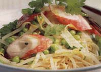 In ruime pan water met zout aan de kook brengen en noedel in ca. 2 minuten gaar koken. Intussen in de wok een laagje van 1 cm water aan de kook brengen en doperwtjes hierin in ca.5 min. bijna gaar koken., doperwten niet afgieten. Intussen korianderblaadjes van de steeltjes plukken. Vervolgens bouquetblokje en vissaus aan de doperwtjes toevoegen en oplossen. Surimi flakes aan doperwten toevoegen, aan de kook brengen en even zachtjes laten sudderen. Taugé en korianderblaadjes door surimimengsel scheppen en even meeverwarmen. Noedels over vier borden verdelen en surimimengsel erop scheppen.