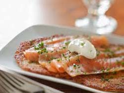 Citroen goed schoonmaken onder koud stromend water en 4 plakjes afsnijden. In een kleine pan (op de vlamverdeler) Hollandaisesaus saus als roerend zachtjes verwarmen. Rest van de citroen iets erboven uitknijpen en sap erdoor roeren. Zalm steaks op magnetron bestendig bord leggen en in de magnetron op vol vermogen (700 watt) 1 a 1 1/2 minuut verwarmen. Pannenkoekjes op een bord leggen en op vol vermogen (700 watt) ook 1 a 1 1/2 minuut verwarmen en halverwege keren. Pannenkoekjes op vier borden leggen. Beetje saus erop scheppen. Zalm steaks in stukken snijden en op de pannenkoekjes leggen. Garneren met een plakje citroen. Rest van de saus rond taartje druppelen. Kappertjes eromheen strooien.