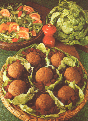 Maak ondertussen van de IJsbergsla 8 nestjes in een diepe schaal. Proef de bietensalade en voeg naar smaak peper, suiker en worcestersaus toe. Laat de gehaktballetjes in de frituur door en door gaar worden en mooi van kleur. Laat goed uitlekken en leg de balletjes even op keukenpapier. Verdeel de bietensalade over de sla nestjes en leg in elk daarvan een vlees balletje.