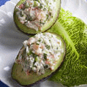 Halveer de avocado's, verwijder de pitten en besprenkel de helften met citroensap. Vermeng de mayonaise, de room en de geraspte schil van de sinaasappel Verwijder alle witte velletjes en pitten uit de sinaasappel en hak deze in kleine stukjes. Voeg de gehakte bieslook of ui bij de mayonaise. Snijd de kip in gelijke blokjes en roer deze door de mayonaise. Verdeel de kip salade met mayonaise over de vier avocado helften. Garneer met gehakte peterselie
