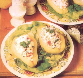 Men de olijfolie met het citroensap, de mosterd het zout en de peper en 1 theelepel suiker. Schil de peren, halveer ze en snijd het klokhuis er ruim uit, wrijf de peren in met de binnenkant van de citroenschil tegen het verkleuren. Of besprenkel met het sap. Meng de Hüttenkäse met de in stukjes gesneden Ham, de mayonaise en de gehakte peterselie en vul de peer helften hiermee. Leg 2 gewassen en afgedroogde slabladeren op een bordje. Garneren met peterselie.